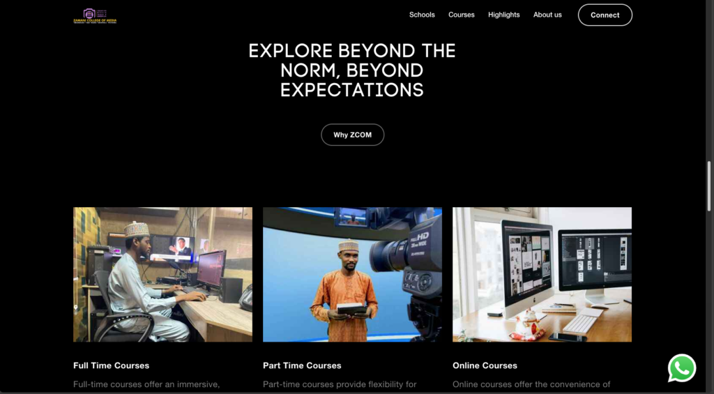 Zcom offers both in-person classes at its campus in Kano and online courses, giving students the flexibility to learn from anywhere while benefiting from the expertise of experienced professionals in media, journalism, filmmaking, and content production. The institution is committed to fostering creativity and innovation in the next generation of media professionals.